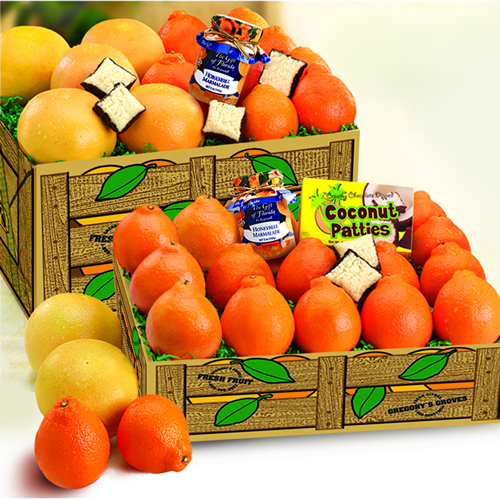 Delicious and easy to peel, Honeybells are Gregory's most popular gift. They will only be available for a few more days, so order now! To make it deluxe, we've added two 3 oz jars Orange Marmalade, and a box of chocolate-coated Coconut Patties.