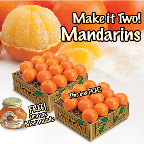 We're mad about our magnificent MANDARINS! A smaller relative of a regular orange, about the size of a tangerine, their thin rinds peels easily, revealing bite-sized, sweet sections inside. We really want you to try our amazing new Mandarins. Ripe and ready to enjoy just in time for Christmas when you order a gift box of 14 Mandarins, we'll add 14 MORE absolutely FREE! With every gift, we'll also include a jar of Orange Marmalade absolutely FREE!
